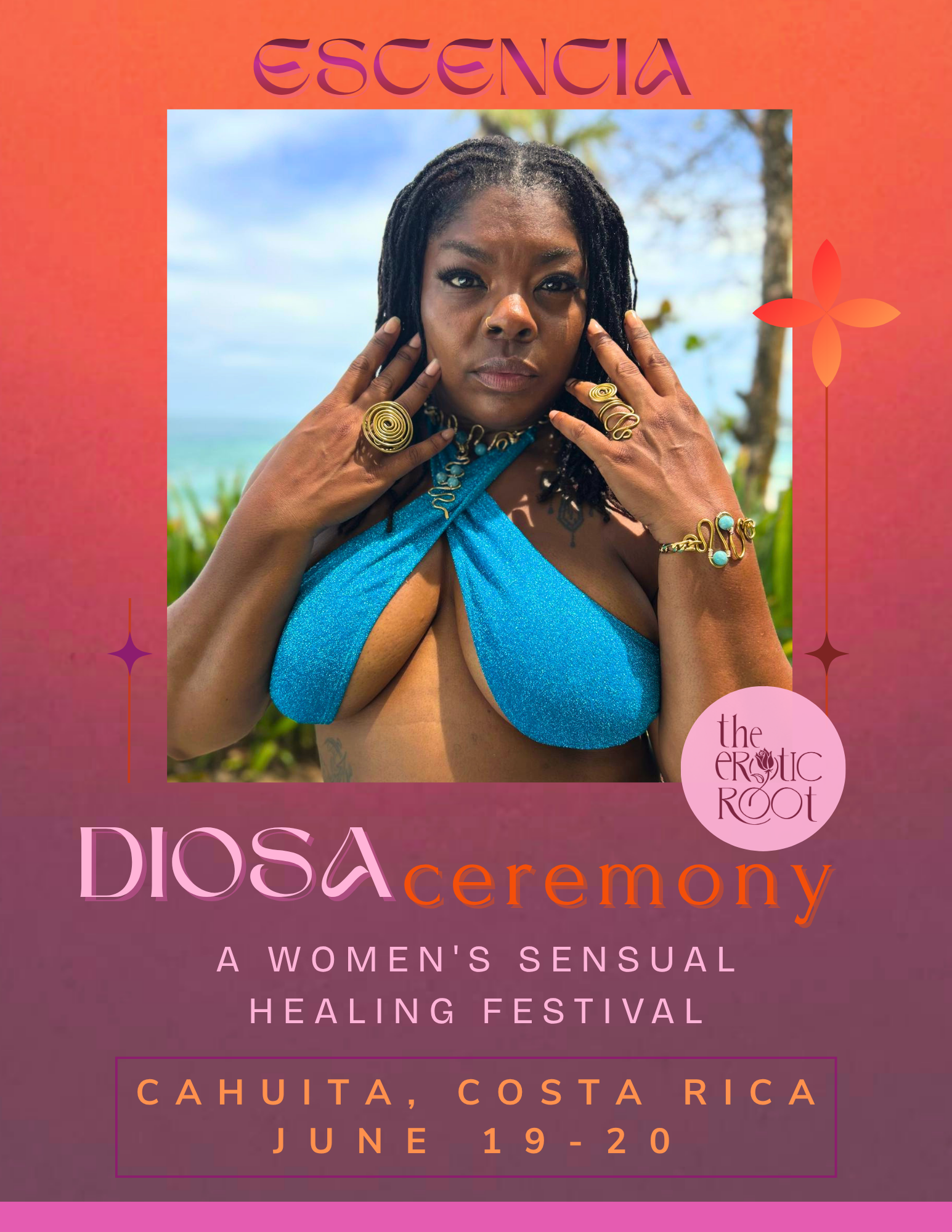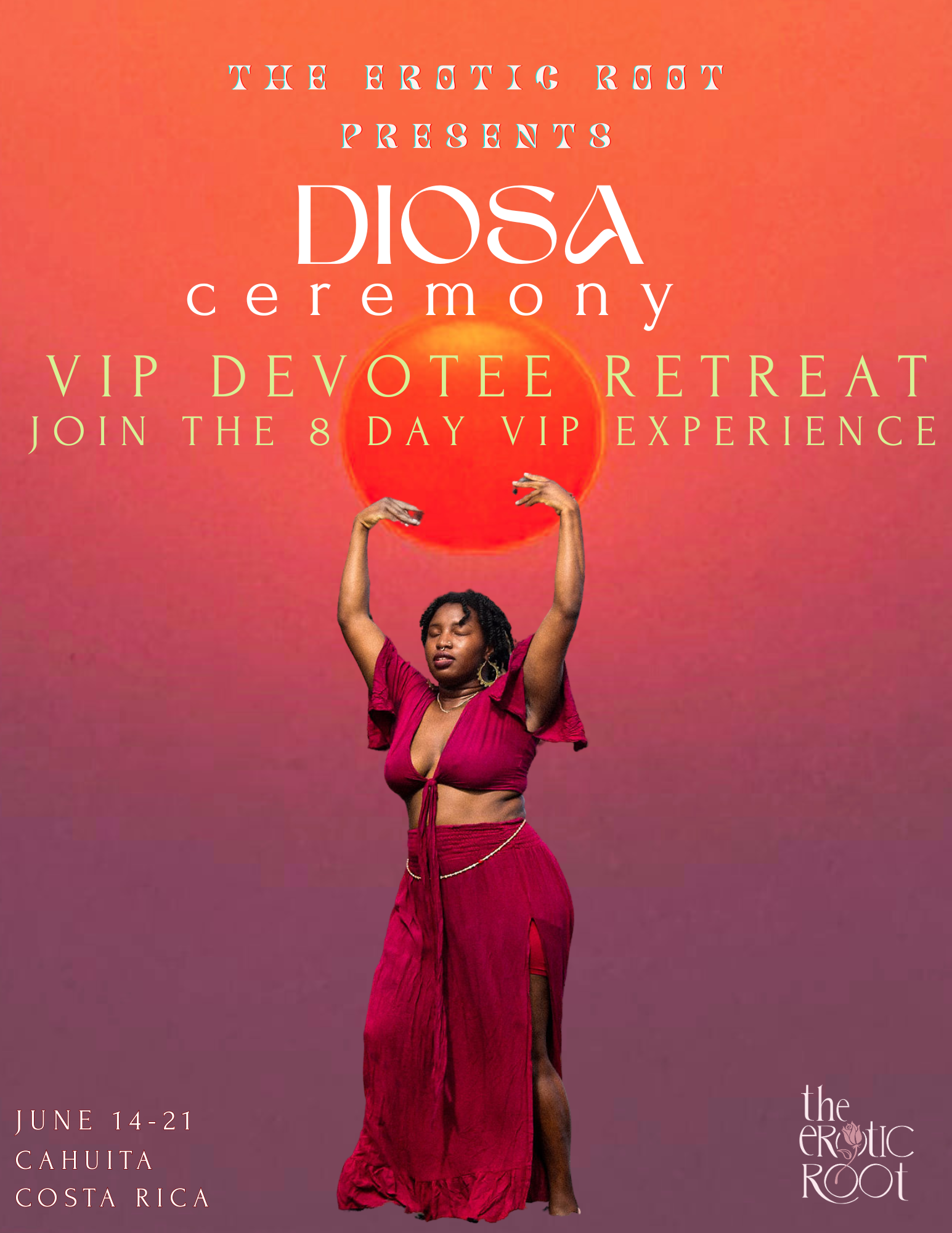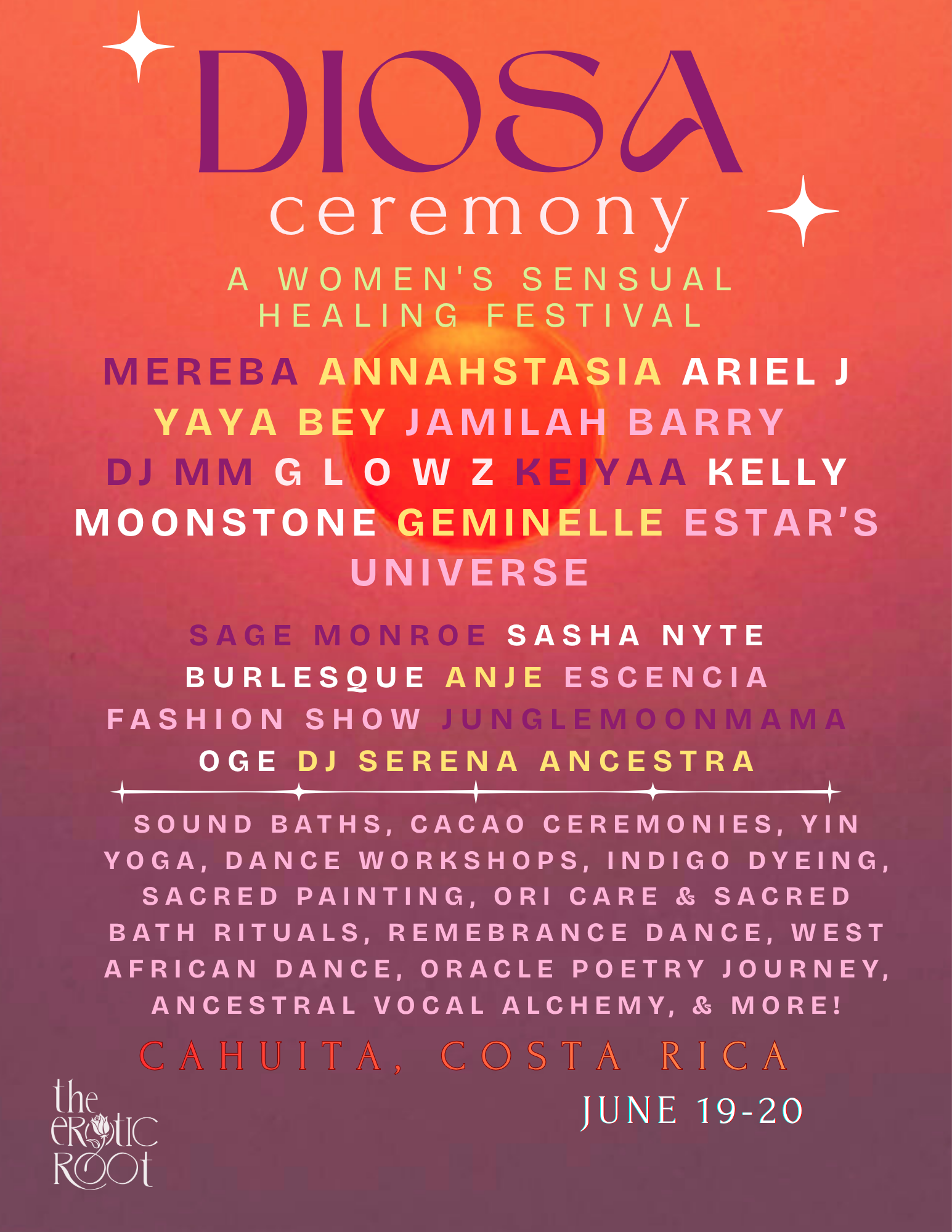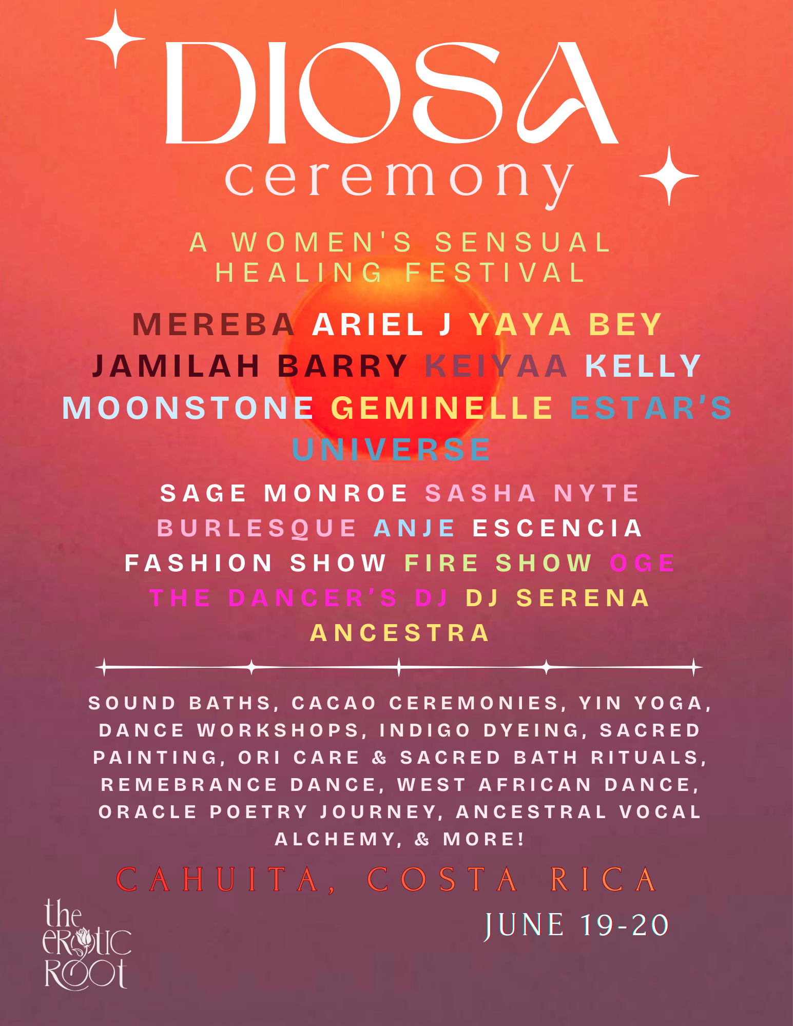 Held on the Caribbean coast of Costa Rica, DIOSA unfolds as a living ceremony — where mornings begin in grounding and devotion, afternoons open into movement and creative expression, and evenings bloom into performance, song, and sensual celebration.